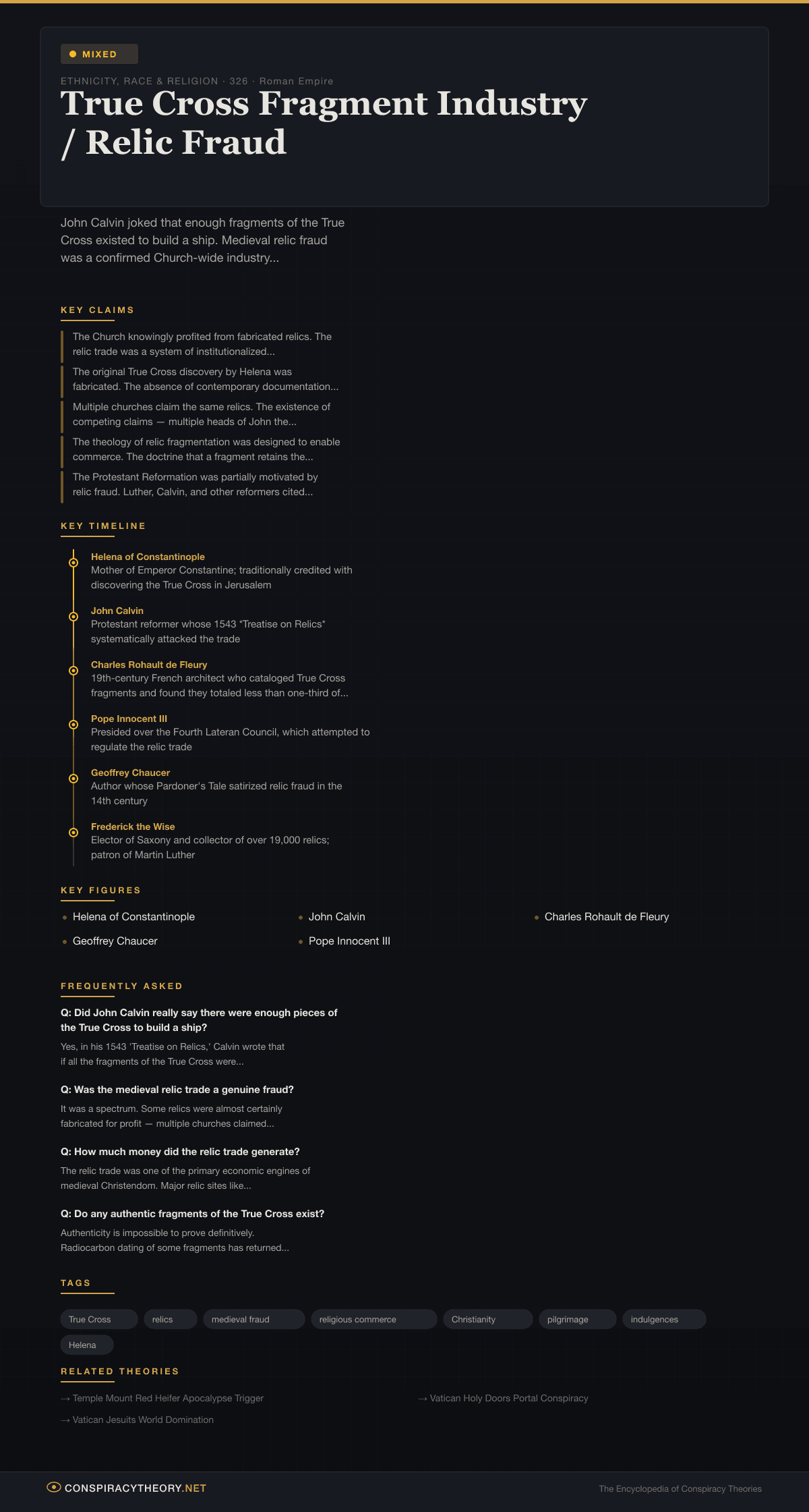 The True Cross relic industry sits in the “mixed” category because the underlying claims contain layers. Was the original discovery by Helena a genuine archaeological find? Almost certainly not, in the modern evidentiary sense. Was the medieval trade in fragments riddled with fraud? Without question. Did the Church knowingly participate in and profit from a system it knew to be at least partially fabricated? The evidence strongly suggests yes. But did every participant understand the relics as fake? No — many clergy and pilgrims sincerely believed in the fragments’ authenticity, and the spiritual value of relics in medieval theology was not strictly dependent on physical provenance.