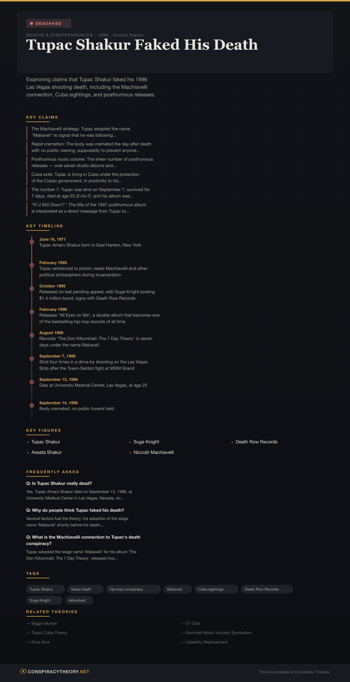 The theory is classified as debunked. Tupac Shakur’s shooting was witnessed by multiple people including Suge Knight, who was driving the car and was himself wounded. His six-day hospitalization at University Medical Center in Las Vegas was documented by medical staff, law enforcement, and family members. His death was confirmed by attending physicians, and a death certificate was issued by the Clark County Coroner. The “evidence” cited by conspiracy theorists consists of coincidences, misattributions, and the common human reluctance to accept the sudden death of a cultural icon.