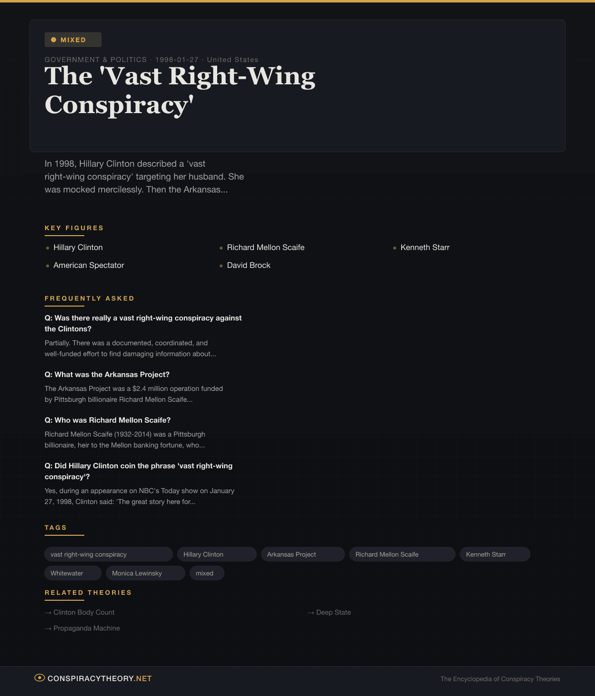 The “vast right-wing conspiracy” was both more and less than Clinton claimed. It was less vast than the phrase implied — it wasn’t a shadow government or a secret society but a network of wealthy donors, partisan media, and political operatives. But it was more real than Clinton’s critics admitted — it was organized, it was funded, it was coordinated, and it produced specific political outcomes.