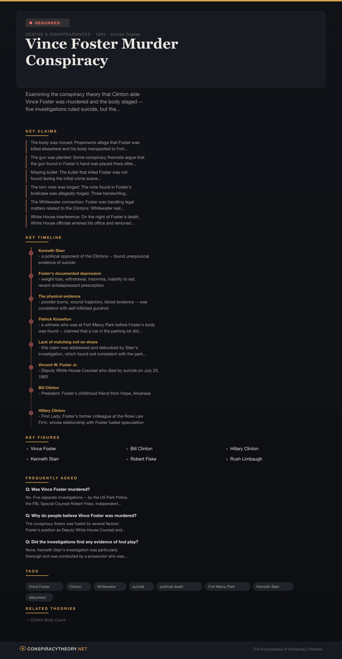 The theory was investigated not once, not twice, but five separate times — by the US Park Police, the FBI, Special Counsel Robert Fiske, Independent Counsel Kenneth Starr, and congressional committees. Every investigation reached the same conclusion: Foster killed himself. The theory is classified as debunked, thoroughly and repeatedly.