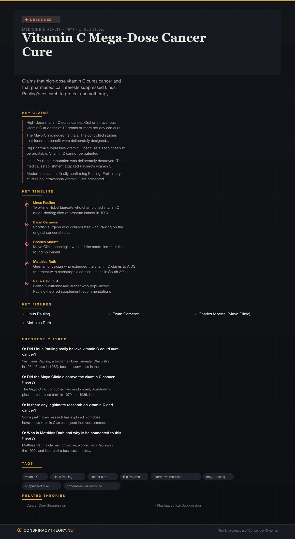 Beginning in the 1970s, Pauling became convinced that massive doses of vitamin C could cure everything from the common cold to cancer. He co-authored studies claiming that terminal cancer patients given intravenous vitamin C lived four times longer than those who didn’t receive it. He wrote bestselling books. He appeared on television. He lent his enormous scientific prestige to claims that, when rigorously tested by other researchers, fell apart. The Mayo Clinic’s controlled trials found no benefit. The scientific community, initially respectful of Pauling’s stature, eventually moved on. But Pauling never did, and the idea he championed metastasized into something far worse than a scientific error: it became the foundation of a conspiracy theory alleging that the pharmaceutical industry had suppressed a cheap, natural cancer cure to protect its chemotherapy profits.