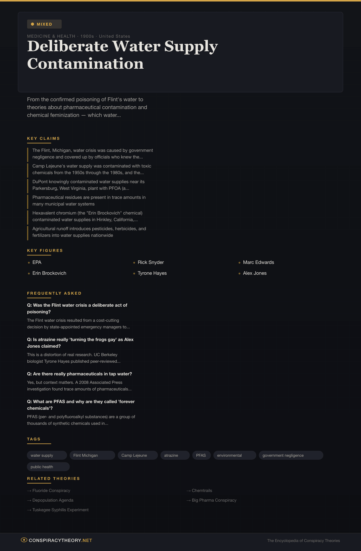 The water contamination conspiracy landscape encompasses a range of claims, from the thoroughly documented to the speculative to the debunked: