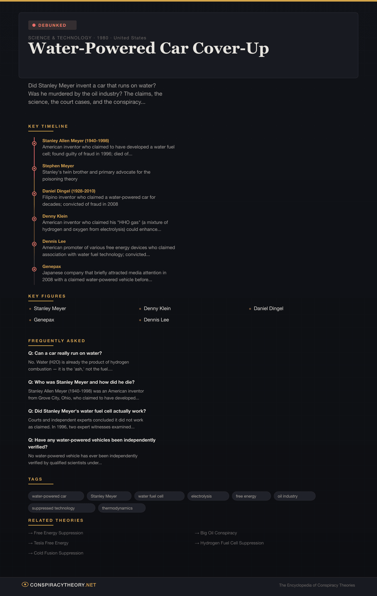 The water-powered car is the ur-myth of energy suppression conspiracies: a lone inventor discovers that the most abundant substance on Earth can replace petroleum, the most profitable commodity in history. Powerful interests — Big Oil, the auto industry, the government — cannot allow this. The inventor dies under suspicious circumstances. The technology vanishes. Humanity remains enslaved to fossil fuels.