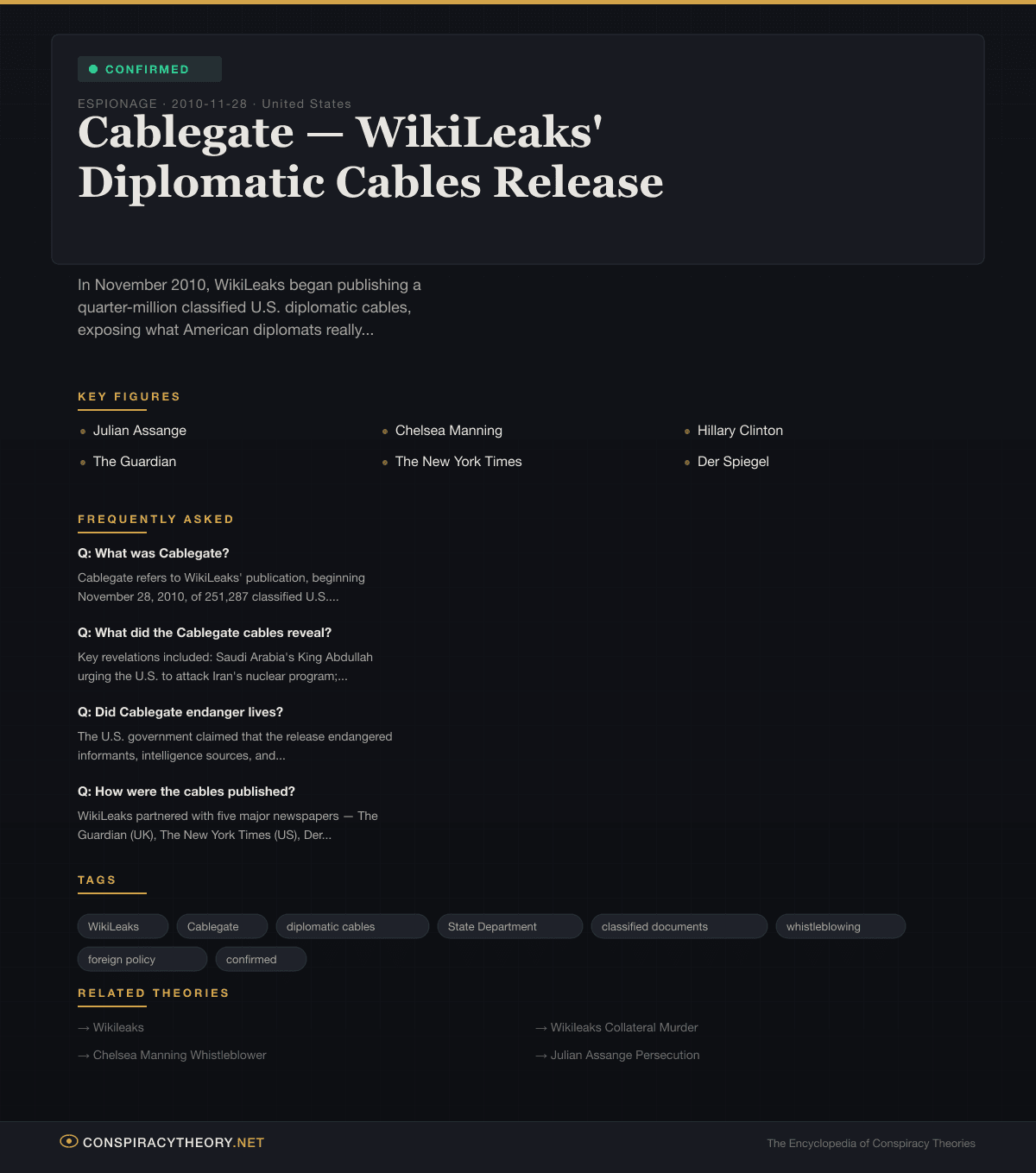 On November 28, 2010, WikiLeaks began publishing 251,287 classified diplomatic cables from 274 U.S. embassies and consulates. The cables — spanning more than four decades, from 1966 to February 2010 — were the unfiltered internal communications of the American diplomatic corps. They contained what American diplomats actually thought, actually observed, and actually reported to Washington, stripped of the euphemisms and platitudes of public diplomacy.