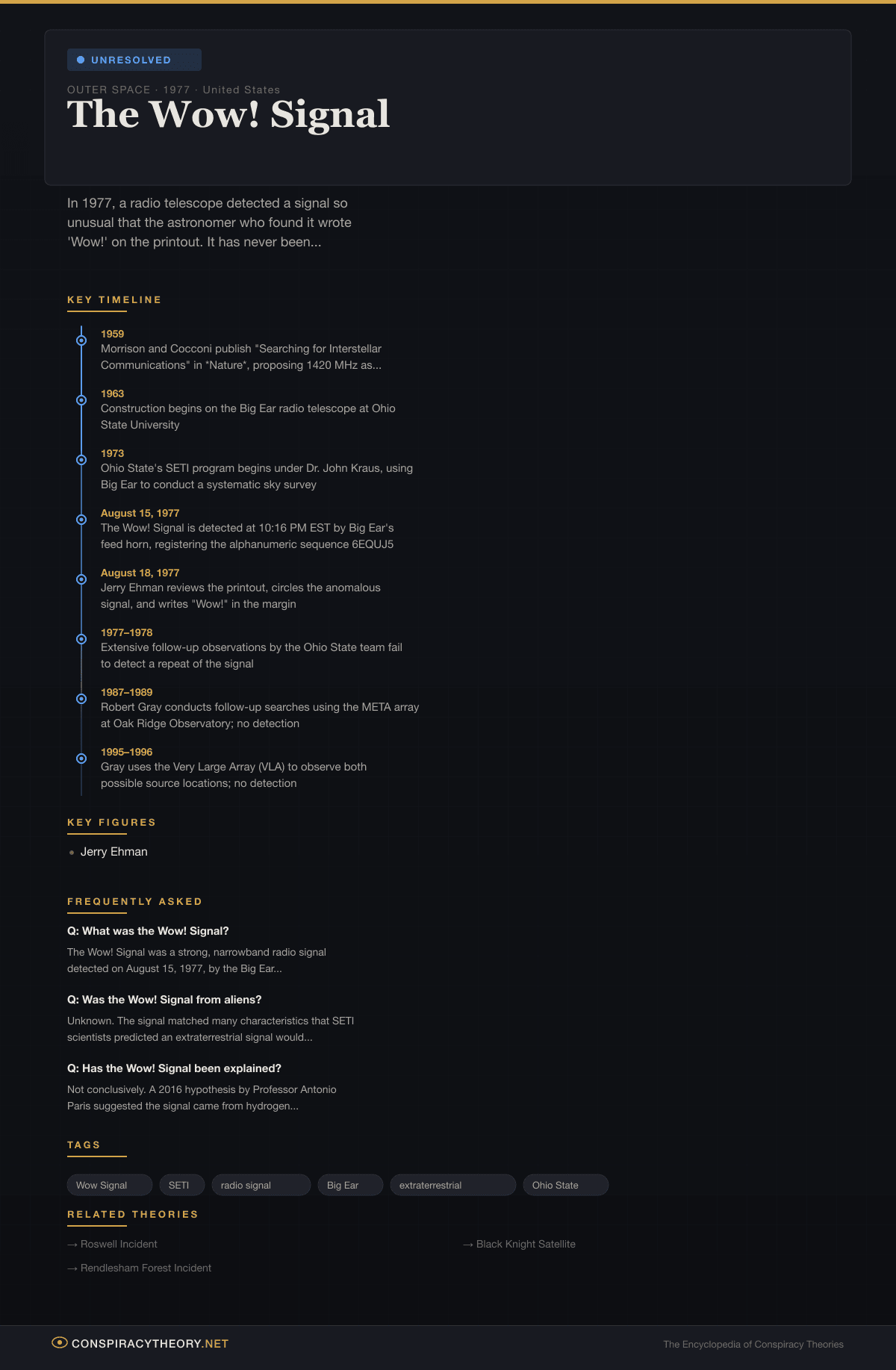 - 2020s — The Wow! Signal remains unexplained; modern SETI programs including Breakthrough Listen continue to search for similar events