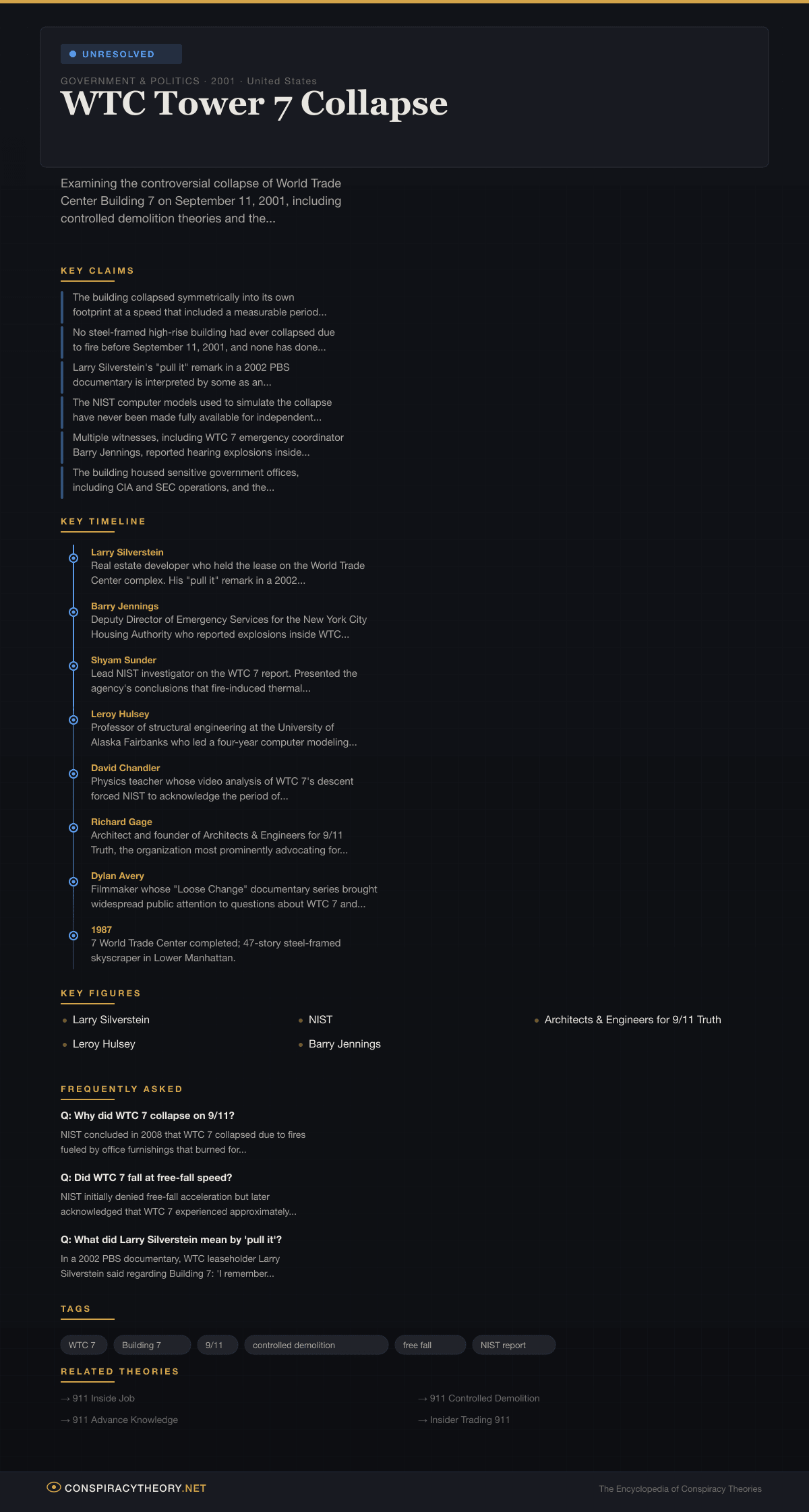 - The building collapsed symmetrically into its own footprint at a speed that included a measurable period of free-fall acceleration, a characteristic associated with controlled demolition rather than progressive structural failure.