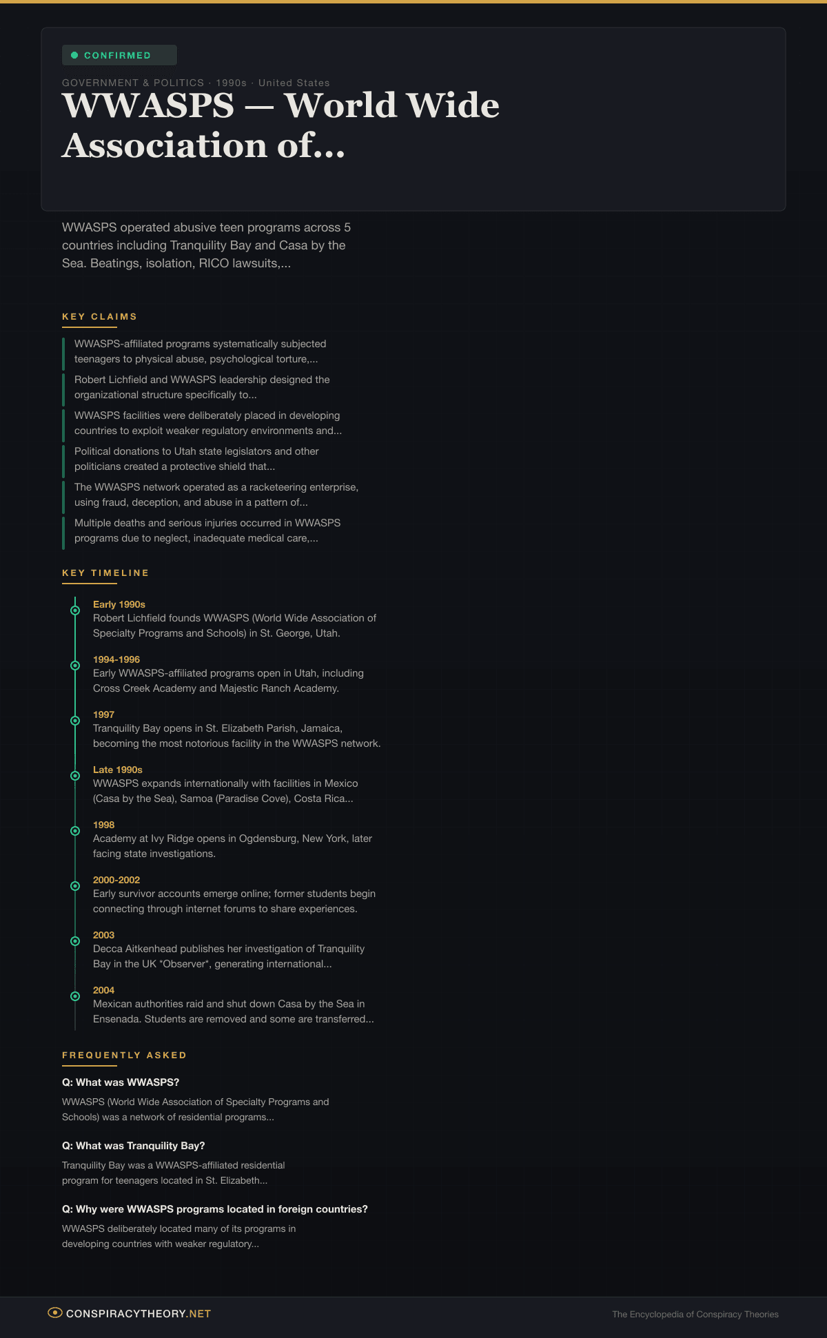 WWASPS was not a single facility but a franchise-like network. Lichfield and his associates provided the business model, the marketing infrastructure, and the referral pipeline. Affiliated programs — Tranquility Bay in Jamaica, Casa by the Sea in Mexico, Cross Creek Academy in Utah, Paradise Cove in Samoa, Dundee Ranch in Costa Rica, Academy at Ivy Ridge in New York, Majestic Ranch in Utah — operated under various corporate structures but shared the same playbook: recruit desperate parents, promise transformation, charge premium fees, and subject teenagers to a behavioral modification regime that survivors describe as systematic torture.